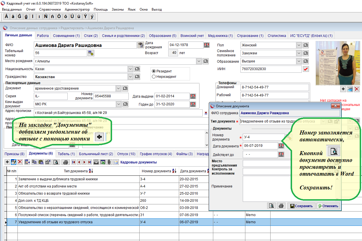 Опишем работу программы "Кадровый учет" по ситуации - оформление отзыва из ежегодного трудового отпуска с выплатой компенсации в соответствии с Трудовым Кодексом Республики Казахстан.