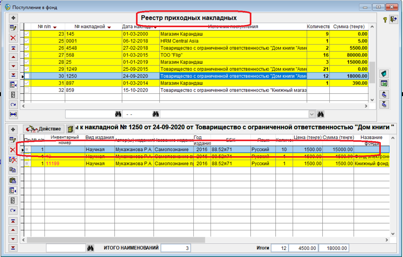 Для этого необходимо в приходной накладной добавить новое издание, которое будет поставлено на безынвентарный учет. В нашем примере, "Мукажанова Р.А. Самопознание" добавлено количеством 10 экземпляров.