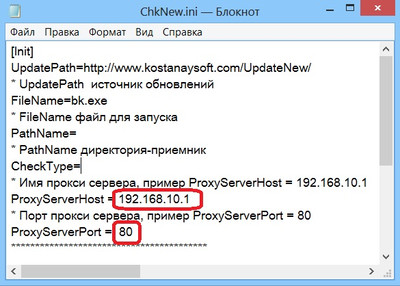 2) Далее в блокноте открываем файл chknew.ini , который находится в той же папке. И вносим значение своего прокси-сервера (параметр ProxyServerHost ) и порта (параметр ProxyServerPort).