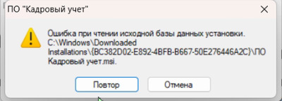 Ошибка при чтении исходной базы данных установки. C:\Windows\Downloaded Installations{...}\ПО Кадровый учет.msi